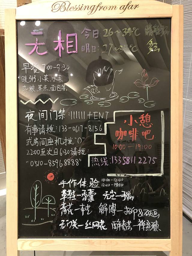 前厅的小黑板上,写明了客栈入住提醒事宜。还有手作体验的时间、地点及项目。
