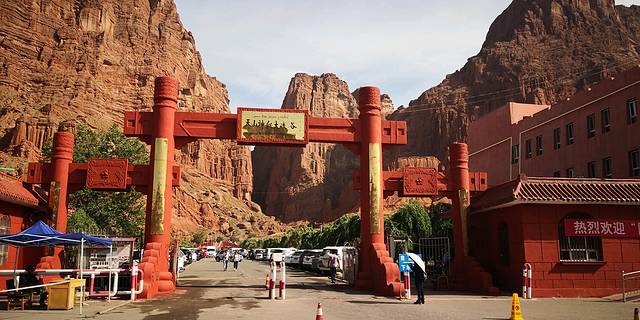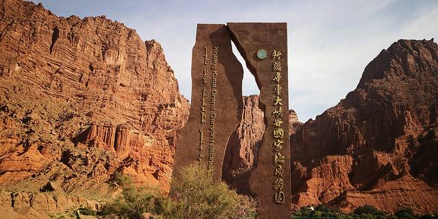 首先到达的是独库公路终点碑(我们是反穿独库公路),这里山丘起伏,形状怪异,我们笑称又是一个“魔鬼城”(指雅丹地貌)。继续行几公里就进入克孜利亚景区,红色的山岭让这里的景色耳目一新,布达拉宫景点就在路边,沿途还有几个小景点。大约10点半钟,我们到了天山神秘大峽谷。