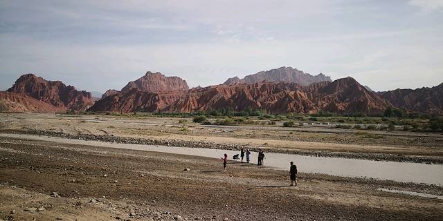 前行到奥依塔克冰川公园处,前方山岭一片火红,其间夾杂黄色、黑色、兰色、褐色,非常壮美!这是地质学上的丹霞地貌。继续行驶到150K时,我们走出了盖孜河谷,来到了美丽的白沙湖。