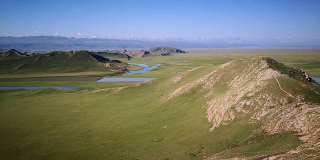 观景台设在一个山丘之上,登台凭栏俯瞰,景色绝美!这是一片由丘陵草原、河流、湖泊、涌泉、沼泽组成的湿地,宽广辽阔,草绿水清。逶迤的开都河像一条絲带飘落在草原上,温顺祥和地靜静的流淌,留下了九曲十八弯的倩景。这绵亘蜿蜒之美令人惊叹!回看身后的草原,绿草茵茵,格桑花盛开,远方的花儿开得一片紫红。草原之美到了极致!