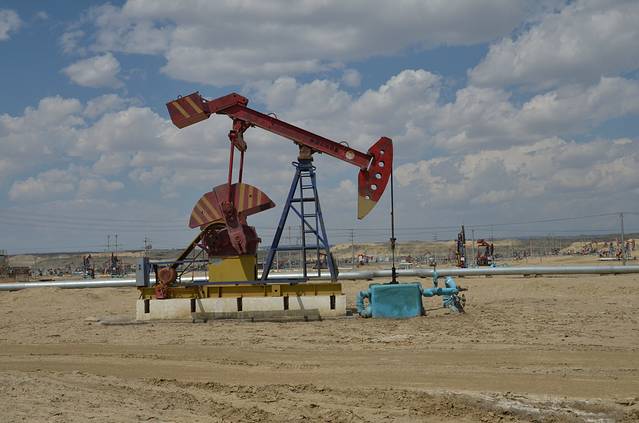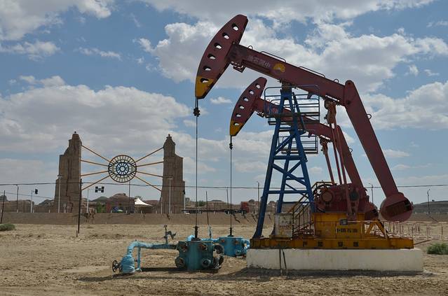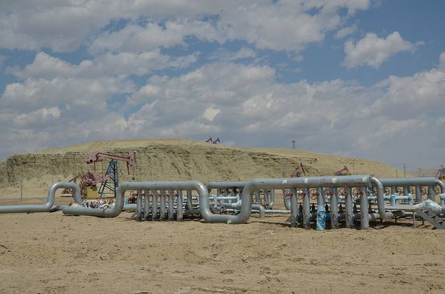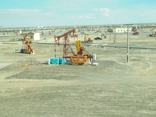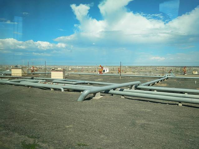 从乌鲁木齐坐3小时40分钟火车就到克拉玛依了。火车进入石河子便是一望无际的平原,那才叫辽阔,一眼望不到边的土地上种满 各种农作物,满眼都是绿色的海洋。越靠近克拉玛依农作物就越来越少,大片大片的荒原上,钻取石油的磕头机站立成另一道亮丽的风景。