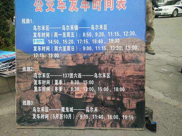 克拉玛依客运站坐客车100分钟就到乌尔禾了。乌尔禾去魔鬼城的客车一天发4班车,在乌尔禾客运中心旁免费乘坐,第一次享受这么优越的国民待遇啊!
