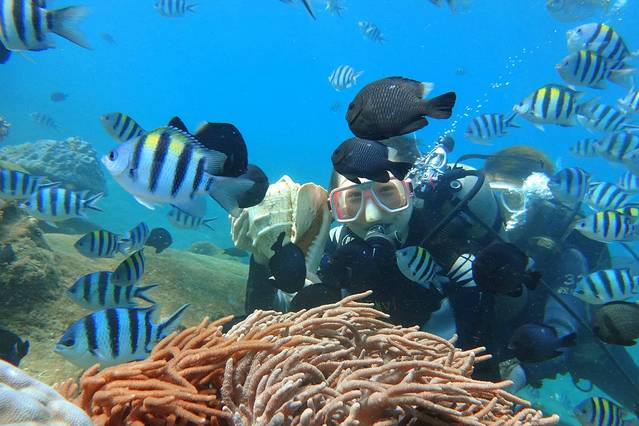 堡礁潜水:从海边下水,是近岸潜水,水深一般3~6米左右,这里有小型的浅水珊瑚,海星,海胆,海参,及浅海热带鱼类,如果投放鱼饵,他们将成群结队的围绕在你身边。这是大部分人都能很轻松潜到的深度。