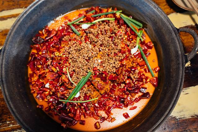 巴适,麻辣,牛油锅底煮出来很香😍熬制的红油用料十足,加热后大块的牛油看着融化。