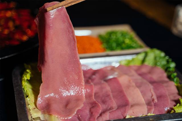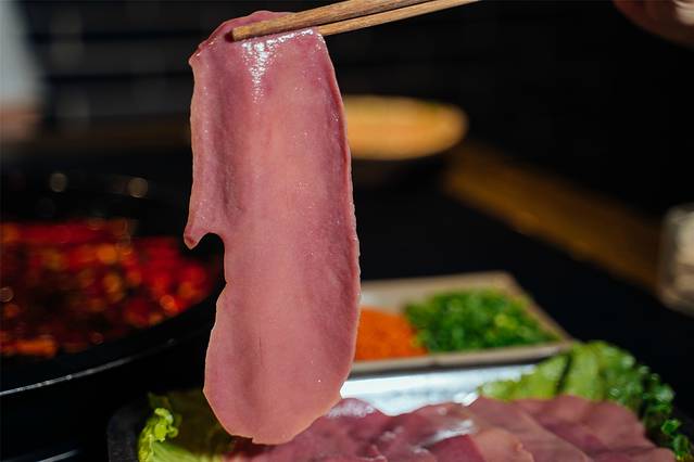 【现切牦牛肉】切得也很薄很均匀 耗牛肉很嫩 它被誉为“牛肉之冠”,富含蛋白质和氨基酸,铁元素 以及微量元素,脂肪含量特别低,热量特别高,对增强人体抗病力、细胞活力和器官功能都有很多作用。绝对值得一尝。