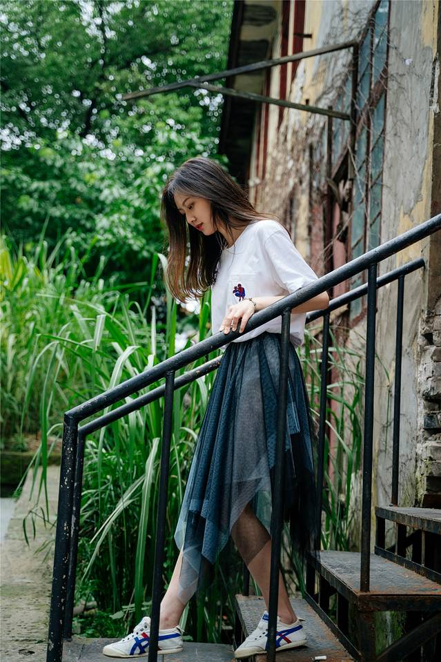 那天穿得非常休闲,简单的T配上绿纱裙,文艺感的裙子搭跑鞋这几年很火~