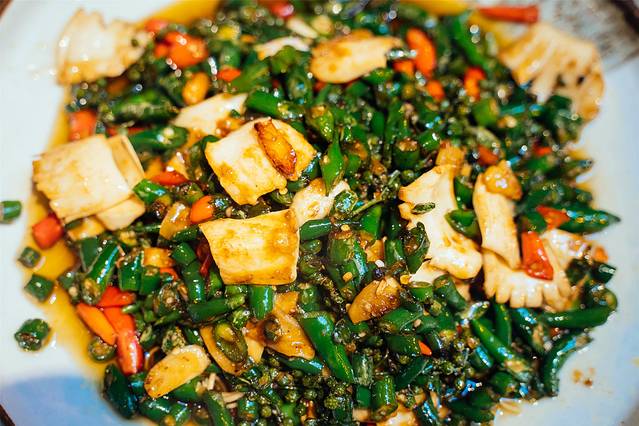 【草包牛肉】搭配各种辣椒非常辣,我看菜单的时候以为是凉拌菜,结果是热菜。一筷子下去,夹杂着辣椒一起吃,很下饭。里面还有豆干。咬一口豆干,满口的豆制品香气和辣椒的香气混在一起,斯~虽然有点辣但是也太好吃了吧。