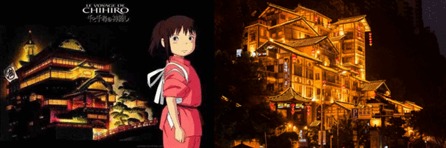 1.电影《千与千寻》中的油屋“澡堂”VS中国重庆的洪崖洞