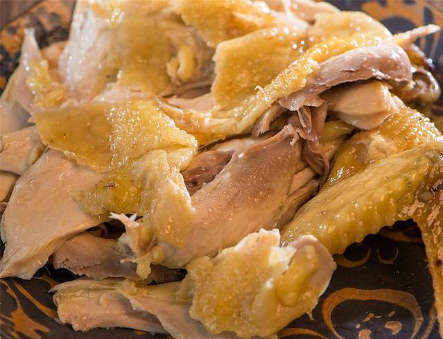 这道菜是广西特色菜肴,取鸡身,以精盐和料酒蒸熟,再起皮,拆骨,加以调料均匀,上碟时以鸡骨垫底,撒上炒过的白芝麻,香气扑鼻,味道香浓,非常好吃,夏秋时分最好食用。