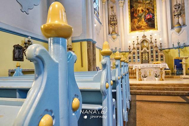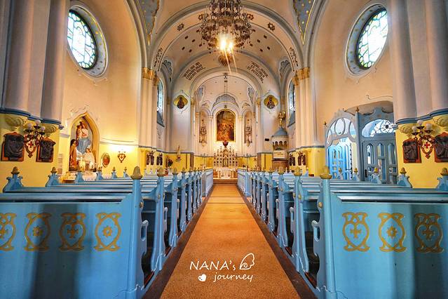 教堂内的所有椅子都是这样的粉蓝色,还有大门和一些装饰花边,设计中还加入了黄色和金色,在白色的背景中,绘出了星星点点的梦