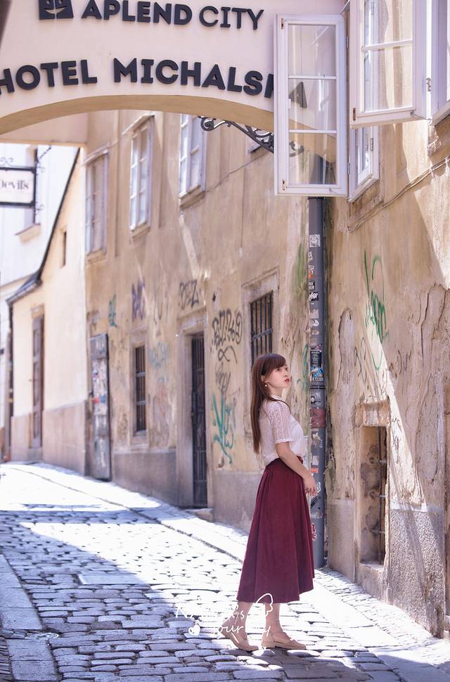 其实我们穿这样的衣服,在欧洲人眼里,还是能引起小轰动的,一路上我和小伙伴的穿着都引来不少欧洲人民的关注和称赞。也许在他们心里,其实还没有忘记自己本来的文化,只是顺应时代革新了。在布拉格的街头,偶遇了一家宫廷复古照相馆,拍照的游客很多,这也是让人很欣慰的事。