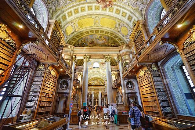 在维也纳,有着650年历史的奥地利国家图书馆,这同布拉格最美图书馆可不一样,此图书馆地位很高,曾经是哈布斯堡王朝皇家图书馆。