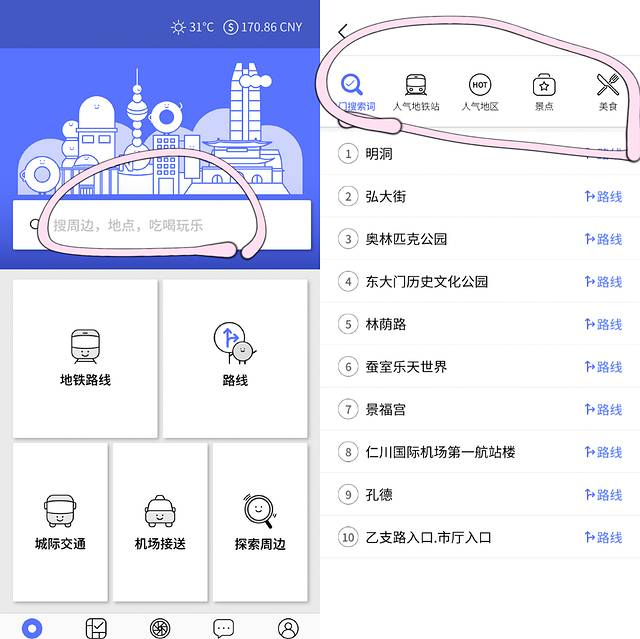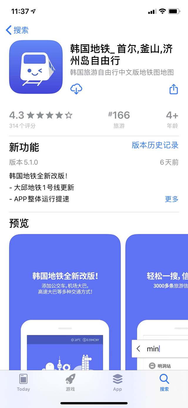 所以我的推荐是去找大多数中国人觉得好吃的店,这样会帮助我们不论是在口味还是在价格以及服务方面都能满足。我用的就是这个,叫韩国地铁,是一个公益型韩国交通旅游app,里面的综合检索功能里包含了我刚刚说到的所有点,大家都能通过这个搜索功能获得更多有价值的信息,能在做攻略的时候帮到自己很多,这个app长这样~