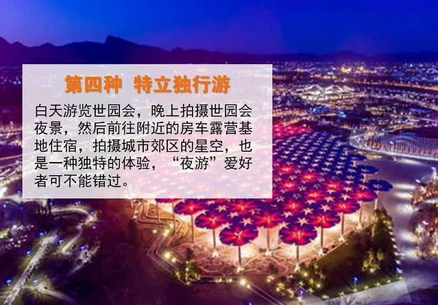第四种,特立独行游,白天游览世园会,晚上拍摄世园会夜景,拍摄城市郊区的星空,也是一种独特的体验,“夜游”爱好者可不能错过。