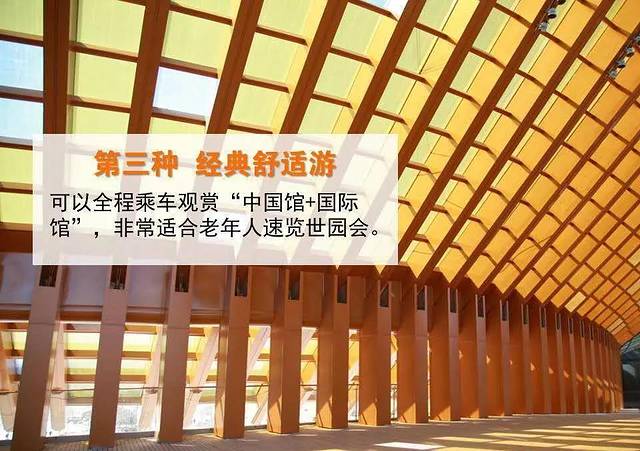 第三种,经典舒适游,特点就是速览经典,可以全程乘车观赏“中国馆+国际馆”,非常适合老年人速览世园会。
