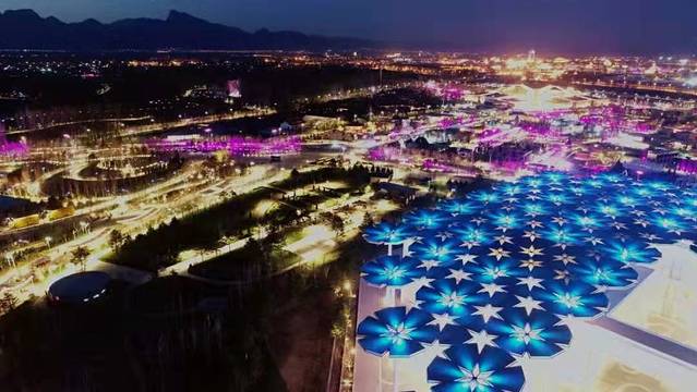 沿途还可以欣赏到世园会的外景,尤其是在晚上,繁星烁烁,灯火阑珊,妫水河蜿蜒流淌,远看这个大园子像极了海上的一座盛世王国。
