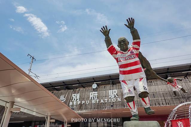 细雨中的这座滨海小镇,湿答答雾蒙蒙的,空气中弥漫着些微的硫磺味儿,JR站的门口,除了一处手汤,还有一座看起来憨态可掬的油屋熊八铜像。这位大叔之所以站在这儿,是因为他提出来许多旅游业的创意,比如推出观光巴士并首次配备女讲解员等,以其巨大的脑洞和精诚的服务精神,带领别府成为了享誉海内外的旅游胜地,称他为别府观光的奠基人也不为过。一年中的绝大多数时间,油屋熊八都是西装革履的模样,不过配合着节日和各种活动,他也会换上不同的衣服,比如冬天时会化身圣诞老人,而为了庆祝即将在九州举办的2019年橄榄球世界杯,他则穿上了红白相间的球衣。