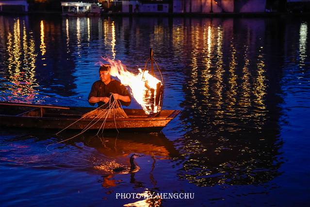 华灯初上时,有一叶扁舟燃着篝火踏波而来。一名鹈匠站在船尾摇橹,一名鹈匠站在船头捕鱼,青衣乌帽,下半身裹着腰蓑,以免裤子被水花濡湿,手中用绳子牵引着6-8只鸬鹚,用嚯嚯声驱赶着它们。鹈舟船头悬挂着点燃篝火的铁筐,火焰照射出受到惊吓四散逃走的香鱼,鸬鹚一头扎入水中叼住鱼儿,鹈匠通过操纵绳子的力度和方向来发出指令,等捕鱼成功将鸬鹚拉回船上,并从它们口中取出香鱼。