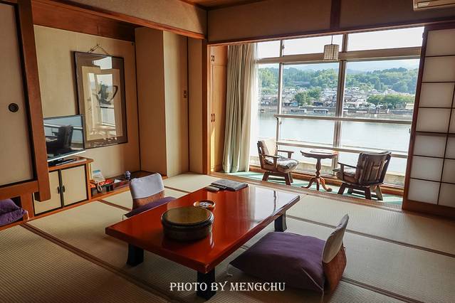 三隈川河畔有很多温泉旅馆,大多是经营了多年的老字号,尽管进行了翻修改建,但仍保留了许多旧时的味道。选在极具日式风情的龟山亭入住,榻榻米房间的落地窗将三隈川的美景尽揽入室,美得仿佛一幅巨大的壁画,让人只想懒懒散散地坐在窗边晒一下午太阳。