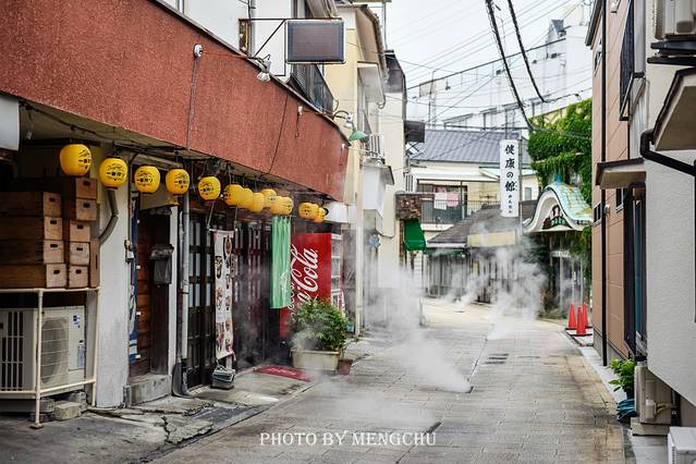 温泉酒店大多是下午3点check-in,时间尚早,便存了行李在附近随处走走。整个城市都笼罩在温泉热气的云蒸雾绕之中,连寻常街道的下水道井盖都升腾着氤氲的热气,到处都是免费的足汤,吃个饭甚至喝个咖啡,都要一边舒服地泡着足汤,关于温泉的一切深深地烙印在这个城市的每一个角落。