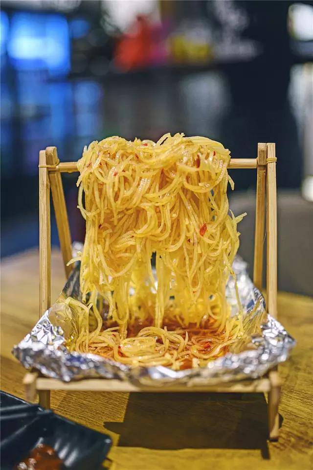 既然要来吃烧烤,烤肉肯定是首选,但是有人不爱吃肉,那就来个招牌素菜:“晾衣土豆丝”,土豆丝切的极细,一根根很长,远看和挂面一样,最后架在一个“晾衣架”上,铺以蒜蓉,辣椒等各种酱料,让人食指大动。