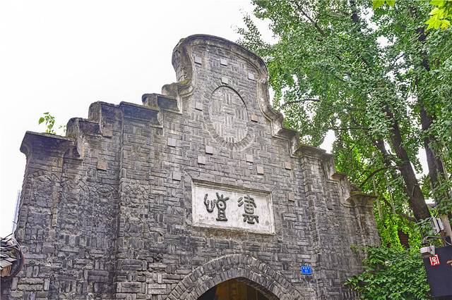 宽巷子是缓慢的怀旧地带,走在11号的时候,看见一个拱形宅门,青砖砌成带有弧形。上面书“恺庐”,是宽窄巷子的标志性门头。“恺庐”的意思是“快乐自在的居住地”。风水原因,往西北方向倾斜的厉害。盛夏时节,树木茂盛,有种“锦官城外柏森森”的感觉,值得一去拍照。