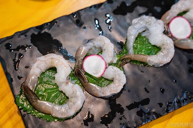 新鲜的虾去头去壳去虾线,再倒入锅中一分钟就能吃到口味甜美的虾了。手打的马鲛鱼滑,很Q弹,肉质紧实,用勺子装吃起来比较方便。