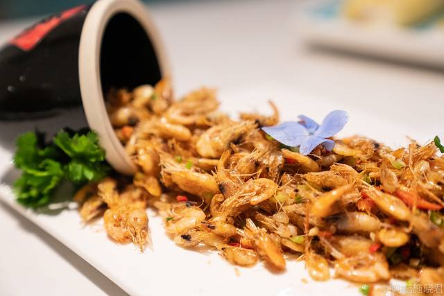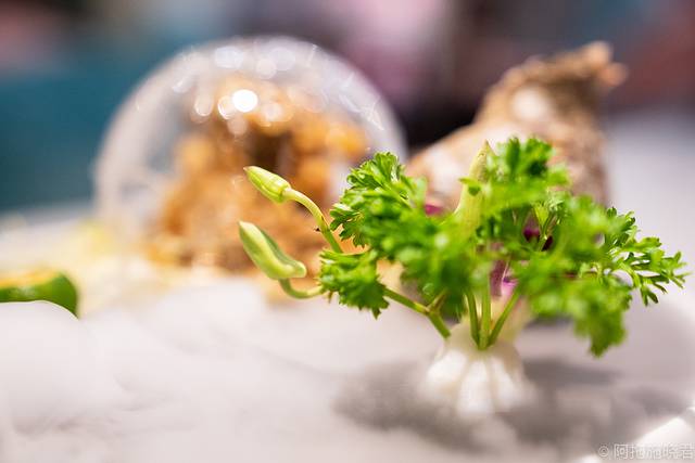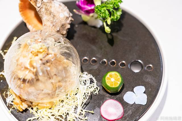 冰盏香螺片,一款用白灼的螺片,吃时蘸上酱油醋以及芥末,正宗的海脚人吃饭的模样。上菜时有点花样,倒上干冰,营造出仙气的感觉。螺片一定要趁热吃,久了就硬了。