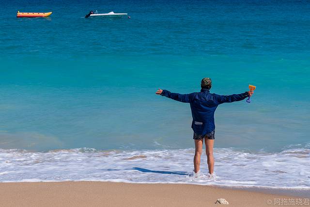 哥们一看就是趁着暑假带着孩子来放松的,手上的铲子出卖了他此刻想要奔向大海的心,看来也只能张开双手感受拥抱一下了。