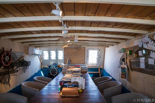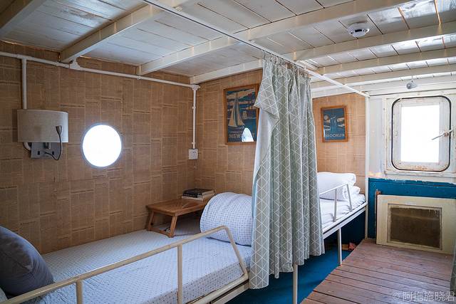 进门便是一片书房,另一边有一个榻榻米,当地的小朋友正坐在上面画着画。跨过甲板,踏入另一艘船,是阅读区和文化沙龙以及可以坐下来写明信片的地方。再往里走,是第三艘船。这里正在做成青旅的模样,船宿一共有8个床位,当前的试住价格在198元/人。