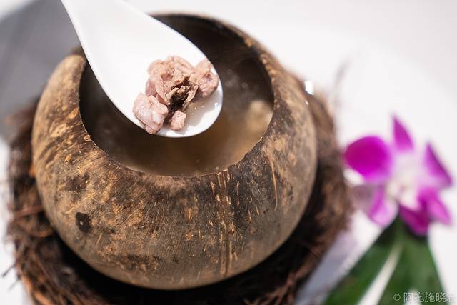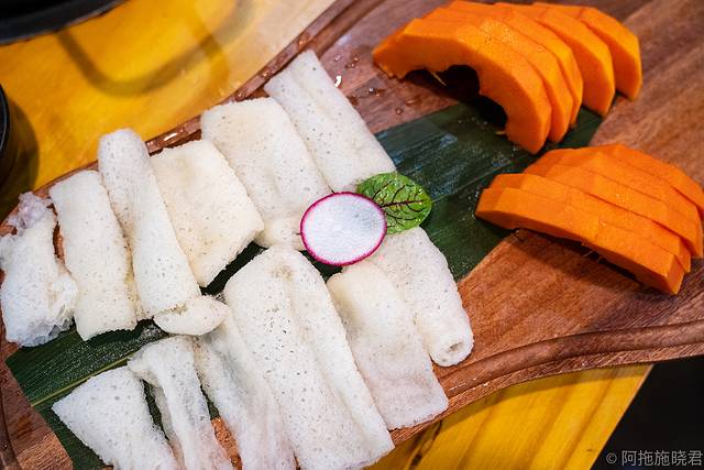 当锅底滚过一番之后,就是将鸡肉倒进煮的时候了,三分钟就献给你最嫩的椰子鸡。竹荪和木瓜是标配,将它们俩加入椰子汁那甘甜清爽的锅底里,木瓜的香味飘然而至,竹荪的口感超赞。
