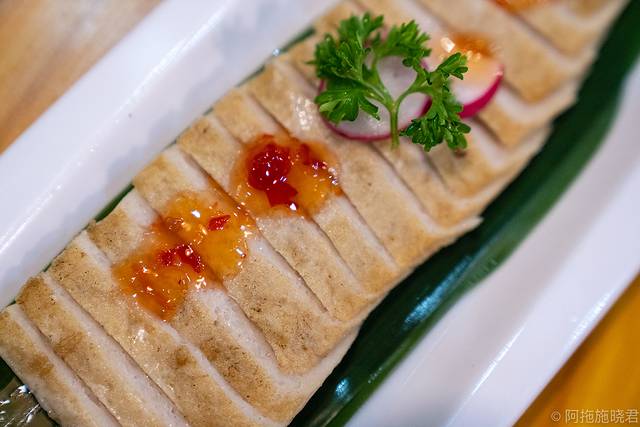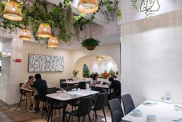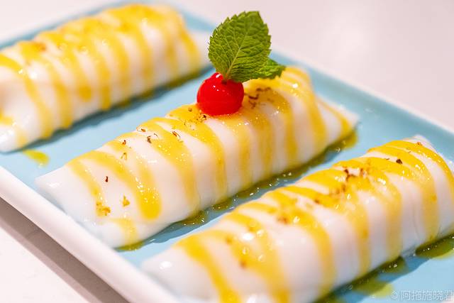 简约的桌椅,大面的白墙,搭配了一些热带植物,看起来还是很舒服的。坐下来稍作休息之后,上了一道桂花芒果卷,凉凉的芒果肠粉是很神奇的口感,里面有椰子的味道。
