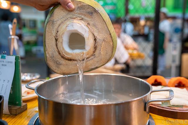 椰子鸡家的装修风格非常的热带雨林feel,相比上次去的大东海店,我似乎更喜欢三亚湾店的感觉。点完菜之后,小姐姐上了锅底,拿来了一颗新鲜的椰子,当面讲椰子汁倒进锅里。