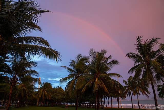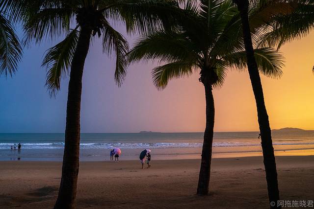 这一场是日落时如此的魔幻,右边是橙黄色的天空,到了左边是暗蓝色的大海,三亚海边的椰子树也算是一大特色。