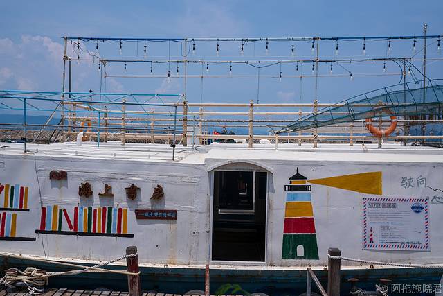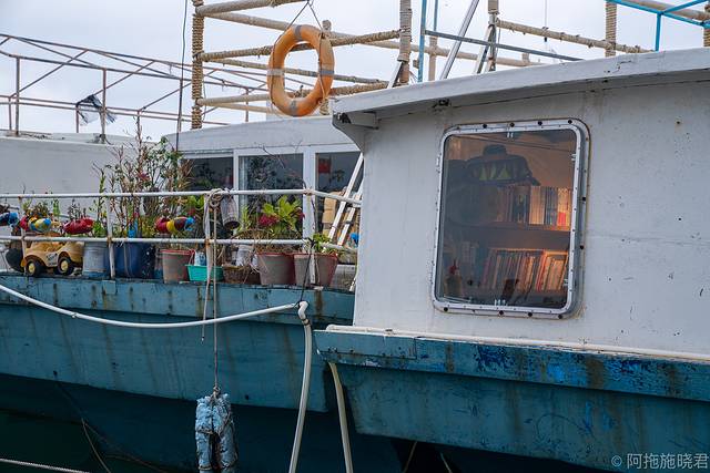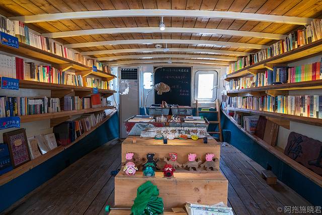 我现在在西岛的海上书屋,这是一个连啤酒都不卖给我的“公益型”+“复合型”书店,整个书屋是由三艘船组合而成的。