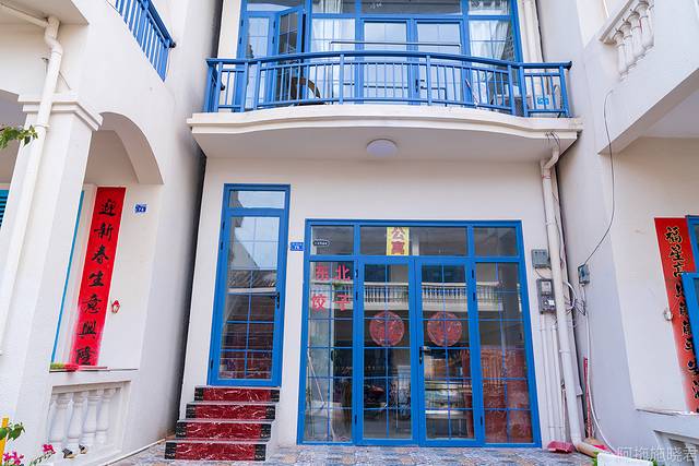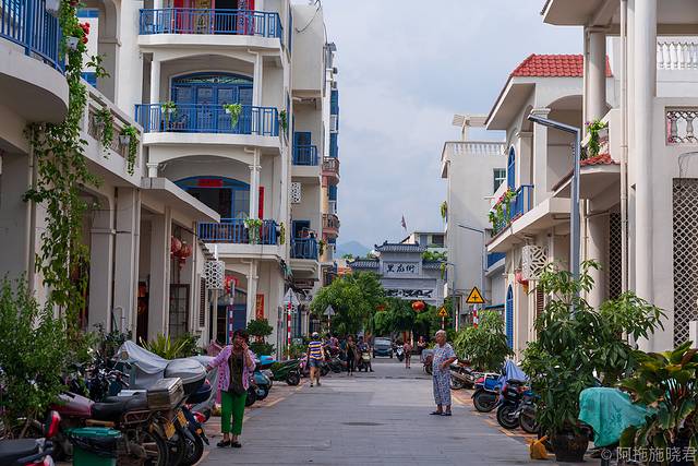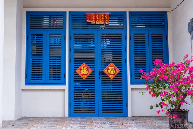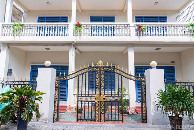 白色的外墙搭配上蓝色的门窗,整条街的风格都一样,干干净净的。人们休闲的在院子里,打麻将、嚼槟榔、扇扇子,就是特别生活的一个地方。