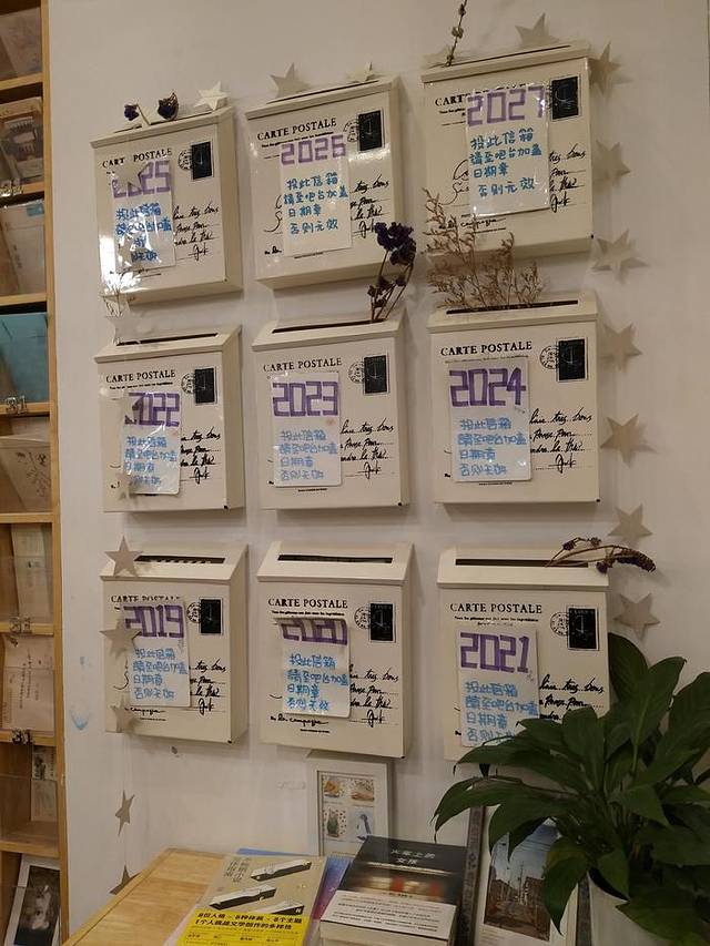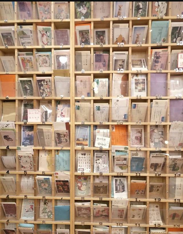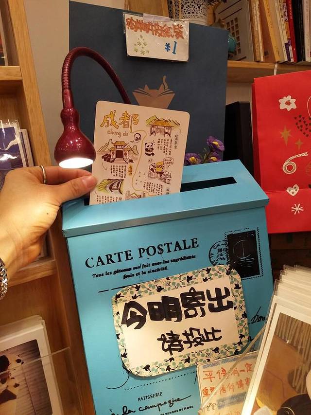 因为这家店有一个很奇妙的一件事,你可以写下一张明信片,然后你要什么时候寄给谁,所以我还给我的朋友选了一张熊猫的。她的是要寄出去的,写上我想说的话,和地址,贴好邮票,最后一步是来到邮筒前,把它慢慢的放进去。一份期待与祝福仿佛一下子就飘向远方了。回到桌前,也给自己的明信片写上一段祝福的话。