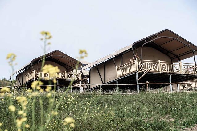这边大概有30顶野奢帐篷,随着山地的形势建造的,有单层和双层的帐篷,情侣、朋友的话推荐单层;家庭游6-8个人住双层就很合适!