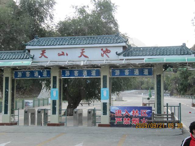 第二天就到天山天池。这个天山天池距离乌鲁木齐只有95公里,几乎是新疆所有旅游景区中交通最便利的一个了,但外地人想去到那里都还是挺不容易的,我在各大旅游网站上不管怎么搜索都只能找到一种去到那里的交通,那就是在南航明珠国际酒店门口和另一个叫做什么“二宫体育馆”的门口去坐那种七八点发车的班车(这个时间相当于内地五六点,而且这段路要走两个小时),实际上,这应该是各旅游团的包车,散客似乎也可以单独买车票坐,但是你与其单独坐个车,还不如就直接跟他们的团一起上山得了,因为这个车只到景区大门口,而那个景区大门口再到实际的景区还有三十多公里!还得再坐将近一个小时才能到得了实际景区!而且,还是需要单独购票的区间车!你还得自己花时间去排队买车票排队坐车。现在是旅游旺季这个时间会耽误多久就不敢担保了。