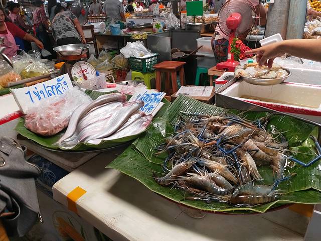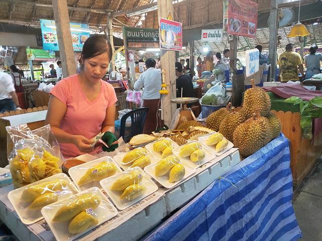 出来海鲜市场交叉口最右的道路上有非常多7-11和乐购莲花,在图示位置有70猪1kg榴莲,感觉全泰国最便宜。据说榴莲品种有6个等级,店主卖的是2和3,3等级的这个时候是当造甜,湿糯,我们每天都帮衬1-2个。同一个地方有两家卖榴莲的,认住这个妹妹,在右边的档摊,10分推荐,必吃!