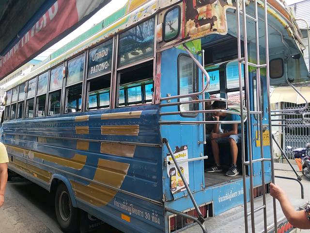 在PADONG BEACH logo位置等这种蓝色的车,每半小时一两车,我们没有看到站牌,也没有看到汽车时刻表,都是看攻略等来的车,哈哈。我们上的10:35分的车,大人30泰铢,小孩15泰铢买票。去程是大巴车,回来是小巴,总之都是蓝色的,不确定就问问当地人。