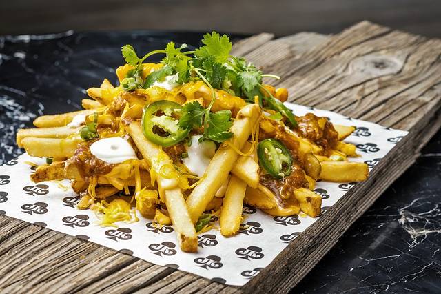 培根、胸肉和碎番茄粒的“脏脏”薯条