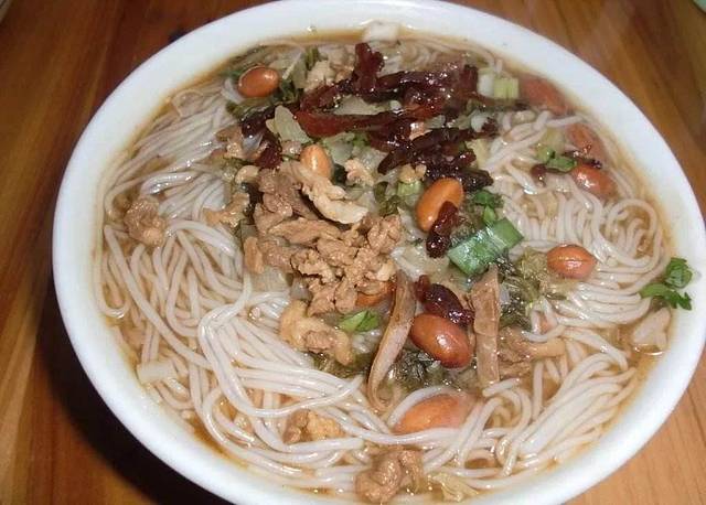 而汤吃,则是配以瘦猪肉、猪肝、猪粉肠、猪肾、猪脾、竹笋、酸菜等,味道鲜美,多吃不腻。