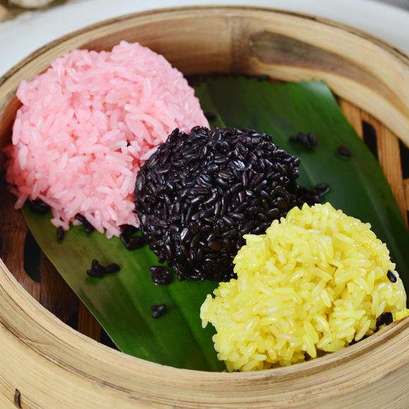 苗家三色饭原为五色饭,分别为黄、红、白、黑、蓝、五色。是用山兰糯米、桑叶、红蓝藤叶、黄姜、椰浆、小山棕叶等植物汁液作为天然色素拌在山兰米中泡制,放在特制的独木蒸笼中蒸制而成。五色饭色彩鲜艳,清香可口,是开胃去火的清凉食品。