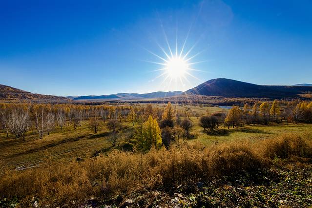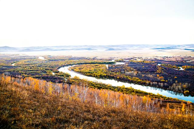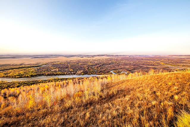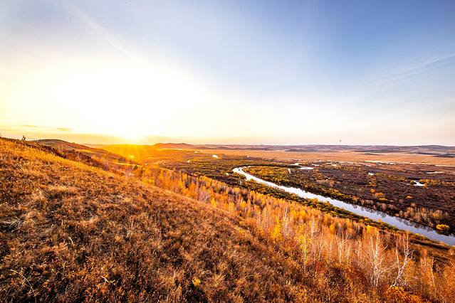 黑山头镇作为中俄边界的重要城镇,聚集的人口较多,对于偶然经过的人来说无非就是一片湿地,好像并没有什么特别的地方,殊不知它的美需要爬上湿地的山坡,爬上湿地边不高的山坡你会发现不一样的美,成片的灌木林游荡着诸多小河,根河在这里与额尔古纳河分道扬镳,最负盛名的还是站在山头观看日落。当落日的余晖洒落在蜿蜒的河面上,寻找合适的角度可以看到几个落日的倒影,所以很多人称此山头为"日落山”。