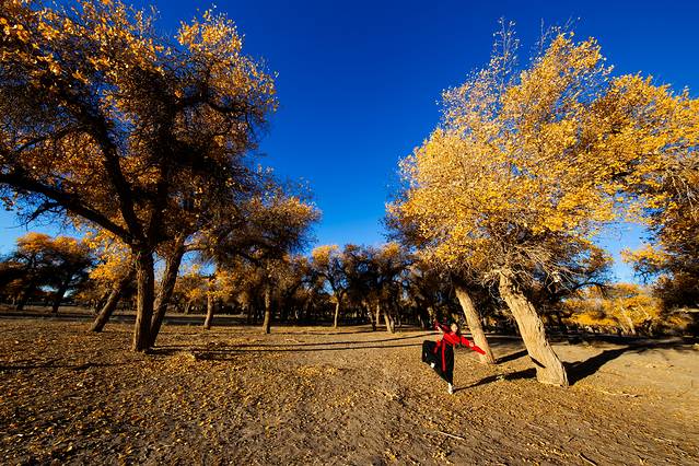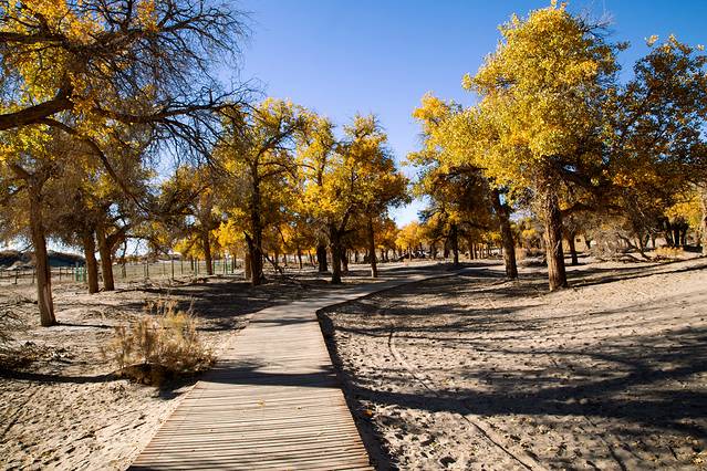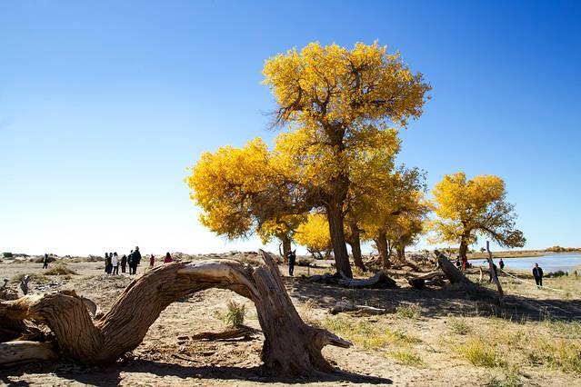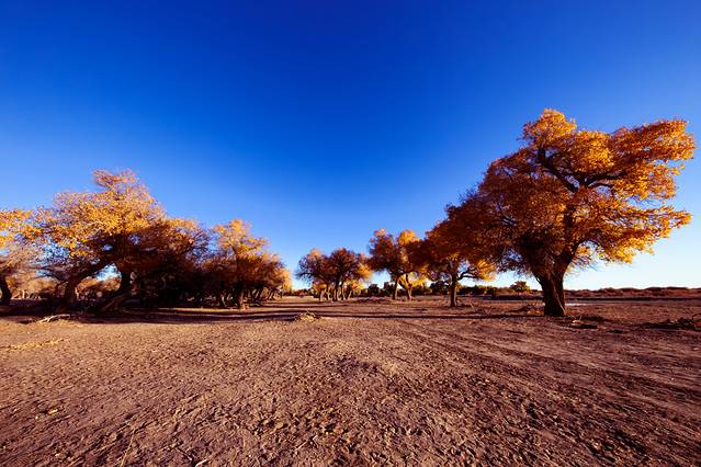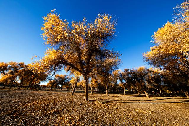 广阔的沙地上,一棵棵胡杨成了这里唯一的树木,贫瘠的土地上因为胡杨的点缀变得神奇,每当深秋季节,胡杨树叶变得一片金黄,形成胡杨秋色,金韵斑斓,奇妙绝伦,赏心悦目,漫步在浓郁的胡杨林中仿佛进入神话般的仙境。