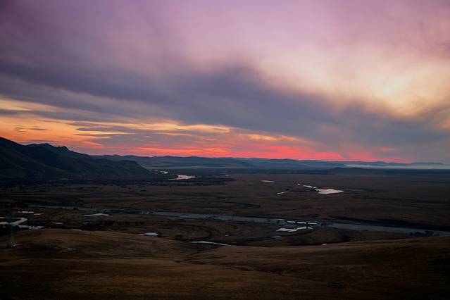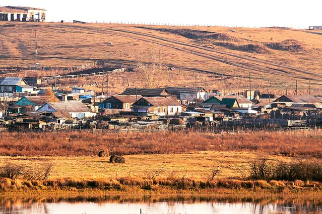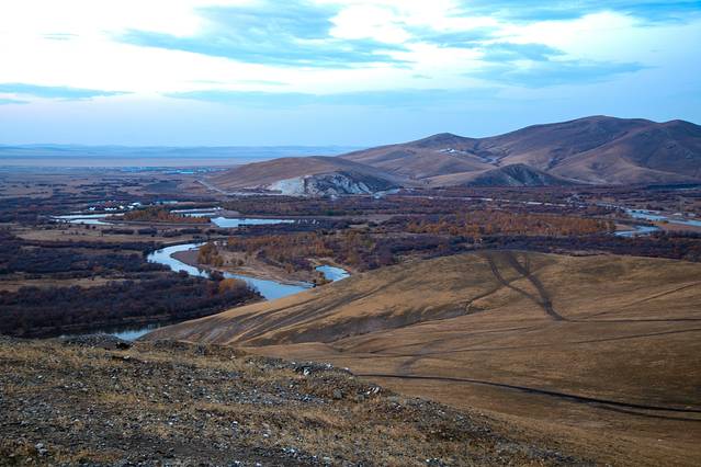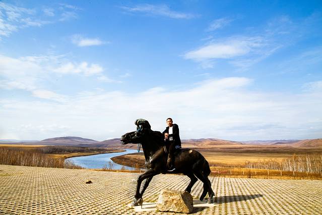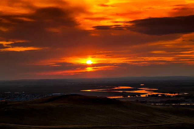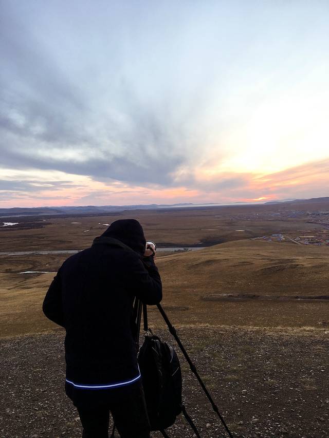到达黑山头已近快落日了,路边停放下车子带上装备就飞快的的奔跑上山,山不是很高坡度却挺长,旁边也有极少数的人一同在追赶着,当然山下是有牧民的摩托车送你上山的,好的越野车也可以开上山头。奔跑着十几分钟才到达,此刻气踹嘘嘘,各个山头都站了少许的摄影爱好者。看着落日一点点的变红,山下的小镇渐渐朦胧起来,远处也能看到俄罗斯的小镇,晚霞映红了天际,也浸染了河水,旁边的单反咔咔咔响动着,一幅幅静态美就这样记录下来。落日消失的很快,约摸着持续半小时,期间云层也遮住了不少,一个完整的落日岂是如此简单,我算是幸运儿吧,刚刚好碰到,旁边的几个爱好者等这一刻都已等待了几天。