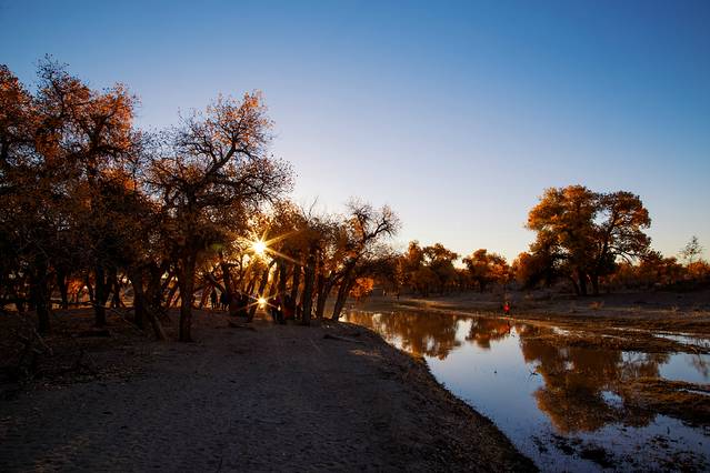 早早的进入观看日出的河道早已被摄影爱好者占据,此时的河流已进入枯水期,倒映的日出并不尽人意,在寒冷中等候了许久也未拍出满意的照片。但随着太阳的升起,夜晚不可见的胡杨慢慢的展露出来,此刻才开始看到一直被人评价极高的胡杨林。