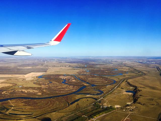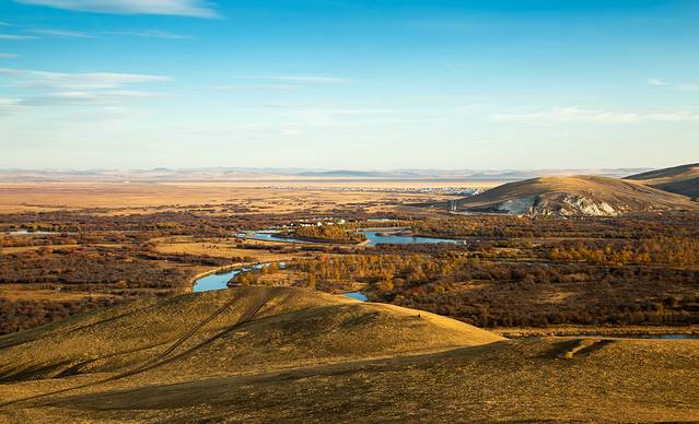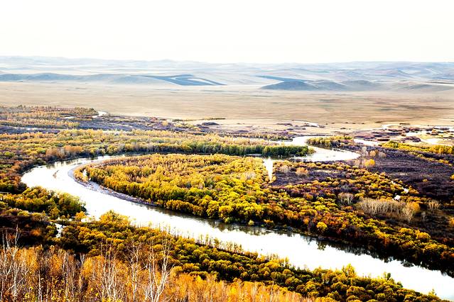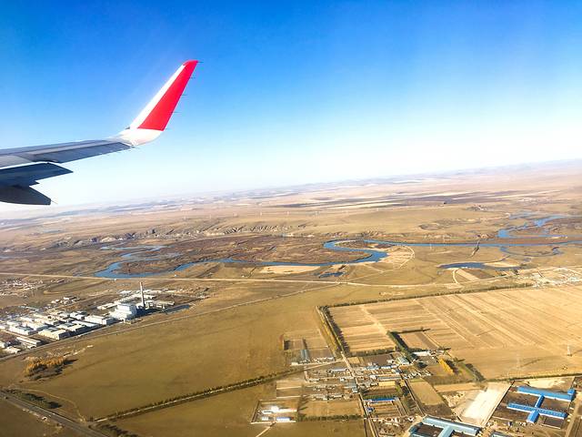 临近海拉尔上空时可以看到地上蜿蜒的河流,河水倒映着蓝天,呈现出碧蓝色,河岸上成片的生长着树,秋叶黄,搭配的如此美丽,一下子就喜欢了这种感觉。