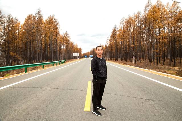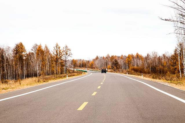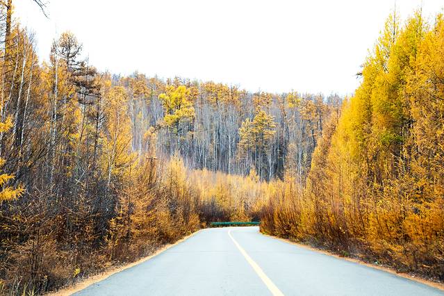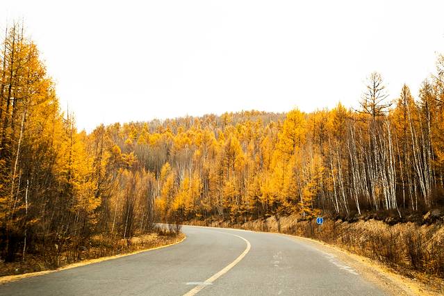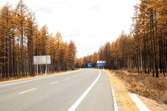 从根河出来一直到莫尔道嘎是成片的松树林,一条宁静的沥青路在原始森林蜿蜒前行,大风吹落的松针在道路上起舞,将漆黑的道路洒满金色。可以想象,在空中俯视着四野无人的莫尔道嘎,一辆车,一条路,就这样如此安静的行驶着,过往的车辆少之又少,这样的场景我想只有无人机才能记录下如此美妙的旅程吧